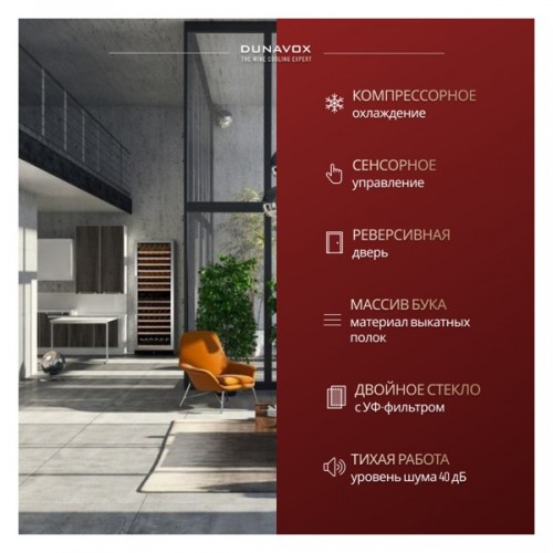 Винный шкаф DX-166.428SDSK Dunavox - предназначен для демонстрации, хранения и создания оптимальных условий для сохранения всех вкусовых свойств вина в бутылках на предприятиях общественного питания, торговли, в барах, ресторанах, специализированных магазинах, частных домах или квартирах. Модель оснащена сенсорной панелью управления и LED-подсветкой синего цвета в каждой зоне. Корпус выполнен из окрашенного металла, дверь - из бесшовной стальной рамы и тонированного стекла с защитой от ультрафиолетовых лучей, выдвижные полки - из нелакированного бука, накладная ручка двери - из нержавеющей стали.