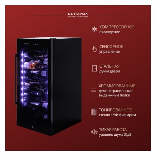 Винный шкаф DX-70.258B Dunavox - предназначен для демонстрации, хранения и создания оптимальных условий для сохранения всех вкусовых свойств вина в бутылках на предприятиях общественного питания, торговли, в барах, ресторанах, специализированных магазинах, частных домах или квартирах. Модель оснащена сенсорной панелью управления, 6 выдвижными полками и электронным термостатом. Корпус выполнен из черной стали, дверь - из черной стальной рамы и тройного тонированного стекла с защитой от ультрафиолетовых лучей, полки - из массива бука и дуба, ручка - из стали.