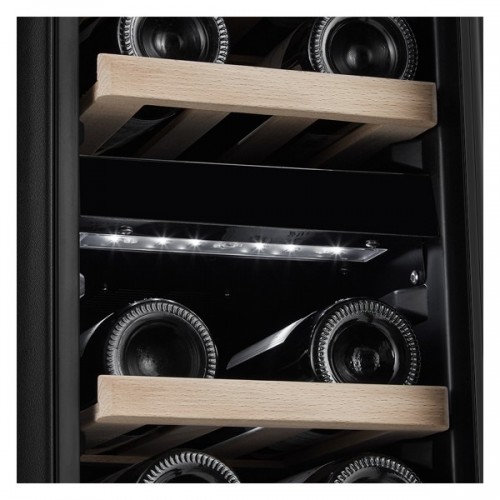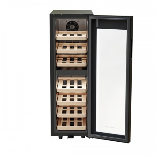 Винный шкаф MV19-KBF2 DP Meyvel - предназначен для демонстрации, хранения и создания оптимальных условий для сохранения всех вкусовых свойств вина в бутылках на предприятиях общественного питания, торговли, в барах, ресторанах, специализированных магазинах, частных домах или квартирах. Модель оснащена сенсорной панелью управления, электронным термостатом и светодиодной подсветкой. Корпус выполнен из окрашенной в черный цвет стали, дверь - из пластиковой рамы и двойного стекла с УФ защитой, полки - из массива бука.