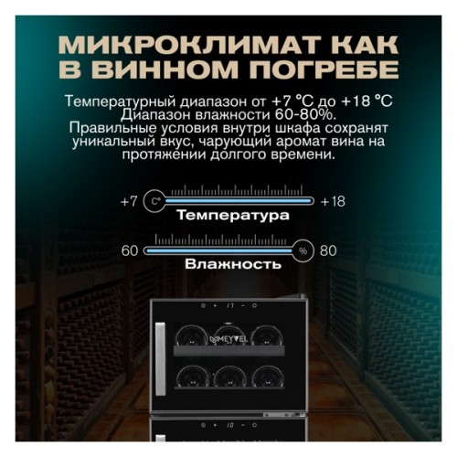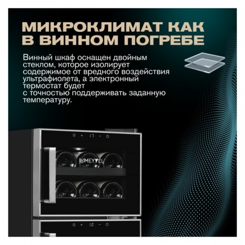 Винный шкаф MV21-BF2 easy Meyvel - предназначен для демонстрации, хранения и создания оптимальных условий для сохранения всех вкусовых свойств вина в бутылках на предприятиях общественного питания, торговли, в барах, ресторанах, специализированных магазинах, частных домах или квартирах. Модель оснащена электронной панелью управления, электронным термостатом и светодиодной подсветкой. Корпус выполнен из окрашенной в черный цвет стали, дверь - из стальной окантовки и двойного стекла с защитой от ультрафиолетовых лучей, ручка двери - из стали, полки - из хрома.