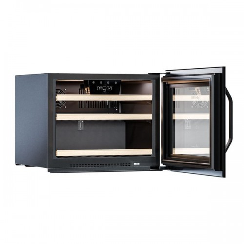 Винный шкаф MV22-KBB1 Meyvel - предназначен для демонстрации, хранения и создания оптимальных условий для сохранения всех вкусовых свойств вина в бутылках на предприятиях общественного питания, торговли, в барах, ресторанах, специализированных магазинах, частных домах или квартирах. Модель оснащена сенсорной панелью управления, электронным термостатом и внутренней светодиодной подсветкой. Корпус и дверная ручка выполнены из окрашенной в черный цвет стали, дверь - из двойного стекла с УФ защитой с черной рамкой, полки - из массива бука.