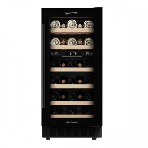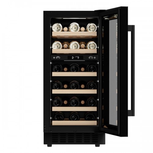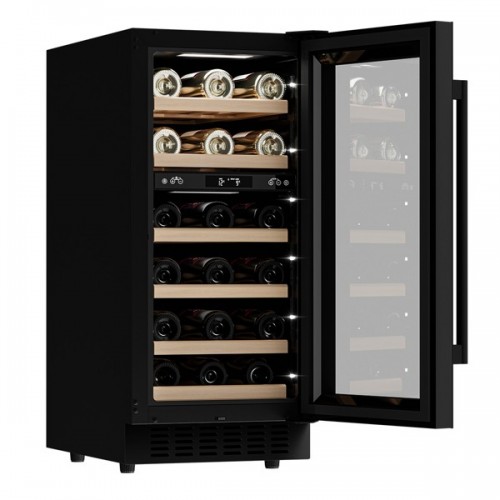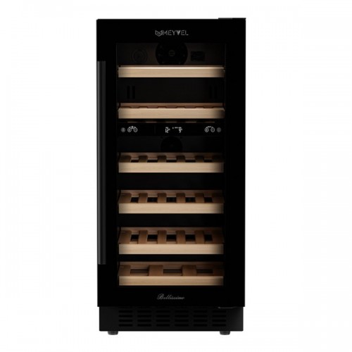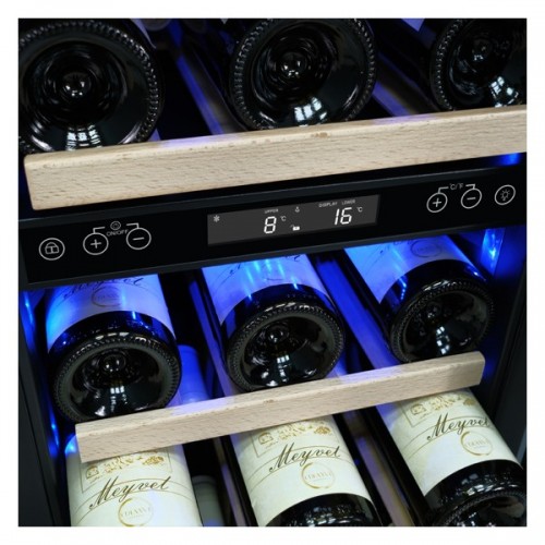 Винный шкаф MV28-KBT2 DP Meyvel - предназначен для демонстрации, хранения и создания оптимальных условий для сохранения всех вкусовых свойств вина в бутылках на предприятиях общественного питания, торговли, в барах, ресторанах, специализированных магазинах, частных домах или квартирах. Модель оснащена сенсорной панелью управления, 2 электронными термостатами и внутренней белой светодиодной подсветкой. Корпус и дверная ручка выполнены из окрашенной в черный цвет стали, дверь - из тройного стекла с УФ защитой с черной рамкой, полки - из массива бука. В комплект поставки входят петли для перенавешивания двери.