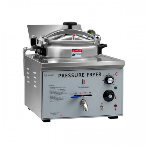 Фритюрница HKN-EPF16M Hurakan - предназначена для обжаривания продуктов, таких как картофель, мясо, рыба, овощи и фрукты в кляре, в разогретом до определенной температуры растительном или животном масле. Продукт, приготовленный во фритюрнице под давлением более нежный, сочный и имеет более насыщенный вкус. Корпус из нержавеющей стали, оснащена электромеханическим управлением, температурный диапазон: от 50°С до 300°С, рабочее давление: 8 Бар, таймер на 30 минут